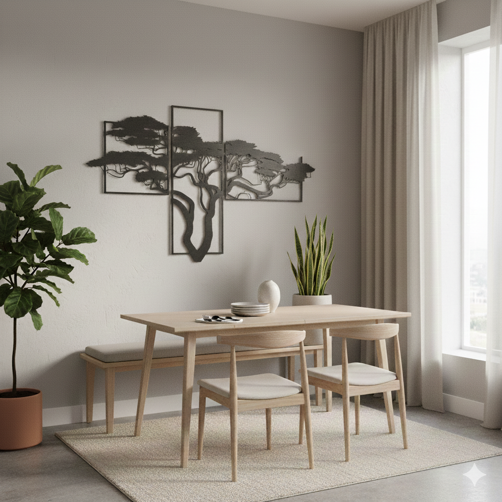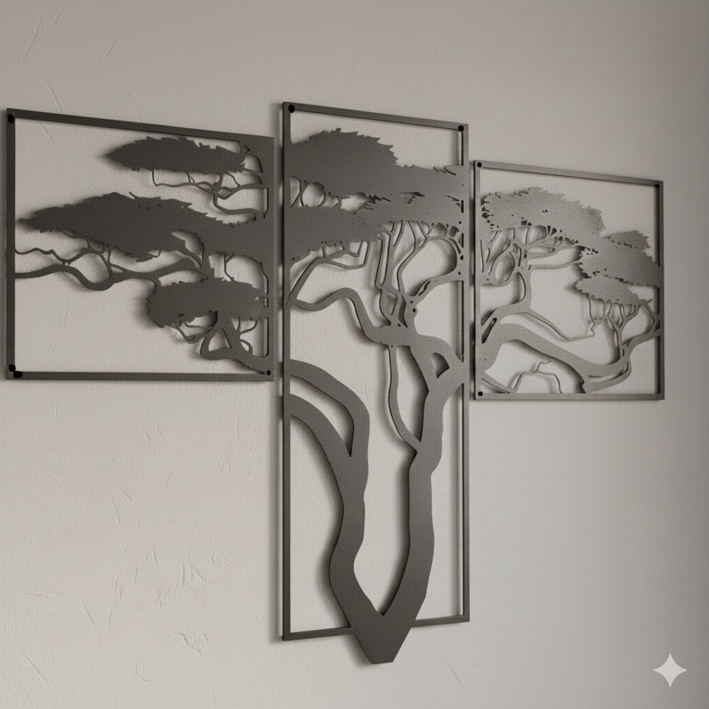 The Design A striking fusion of nature and modern art, this triptych features a sprawling tree silhouette that stretches across three independent panels. The intricate, laser-cut branches flow seamlessly from one panel to the next, creating a sense of continuity and “breathing room” on your wall. The silhouette design uses the wall itself as a backdrop, making the art feel like an architectural window into a forest.