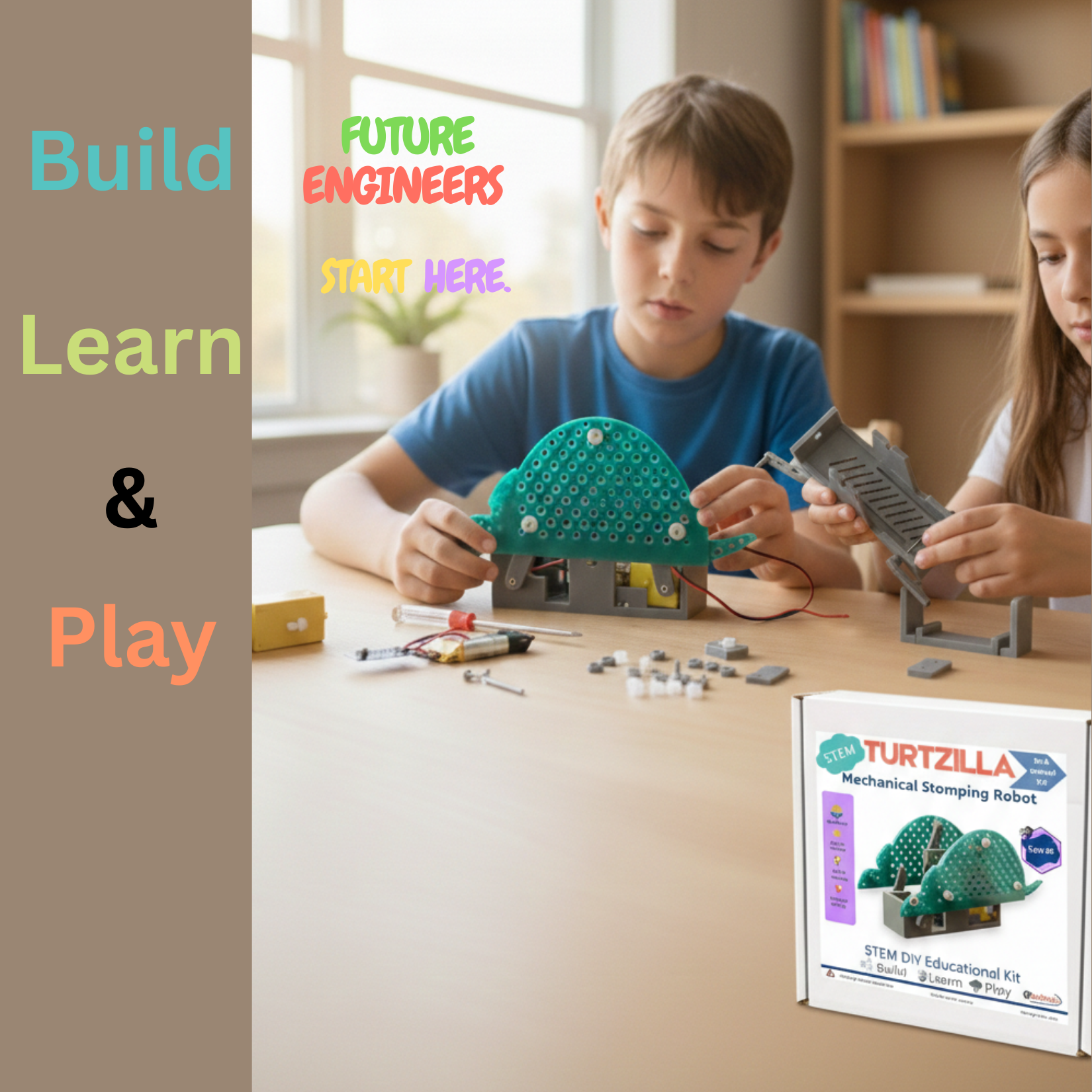 Turtzilla is a hands-on STEM DIY kit that lets children build a turtle-inspired stomping robot capable of crossing small hurdles. Through assembly and experimentation, kids explore mechanical motion, balance, and structural design while developing real engineering skills.