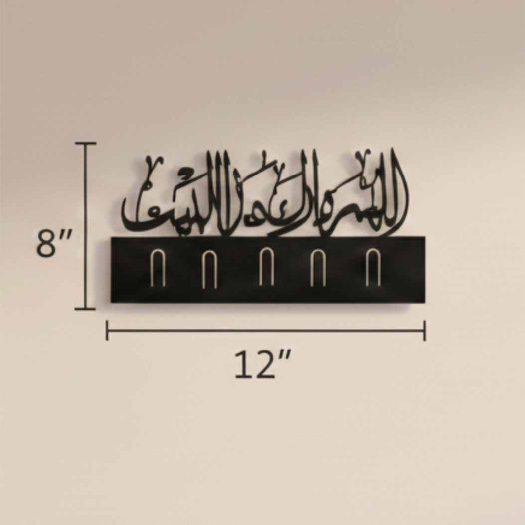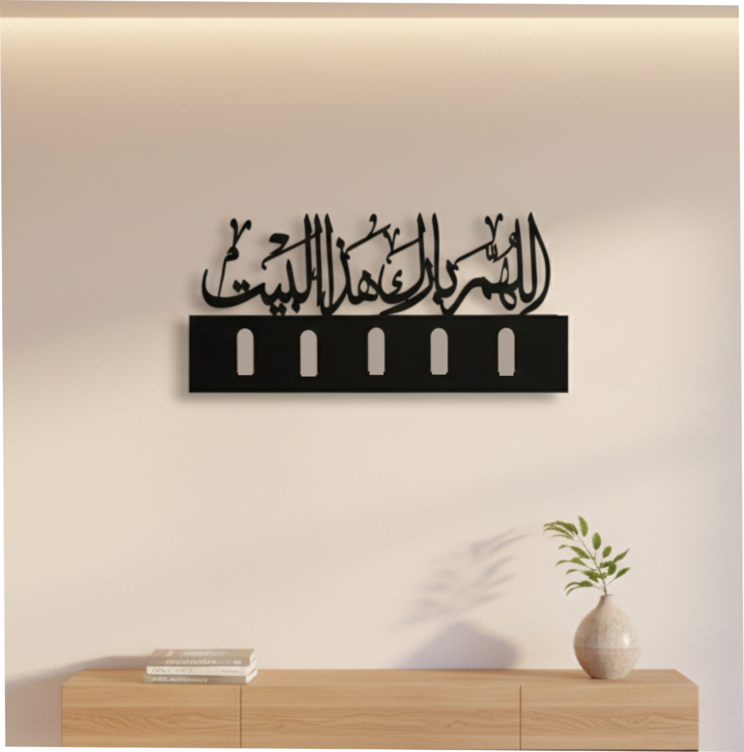 Grace in Every Transition. Elevate your entryway with the Barakah Key Holder. This 5-slot organizer is masterfully crafted from architectural-grade mild steel, featuring intricate Arabic calligraphy. Designed with a 3D standoff mount, the sacred script “floats” against your wall, casting elegant shadows that shift with the light. It is more than a utility—it is a statement of faith and fine craftsmanship.