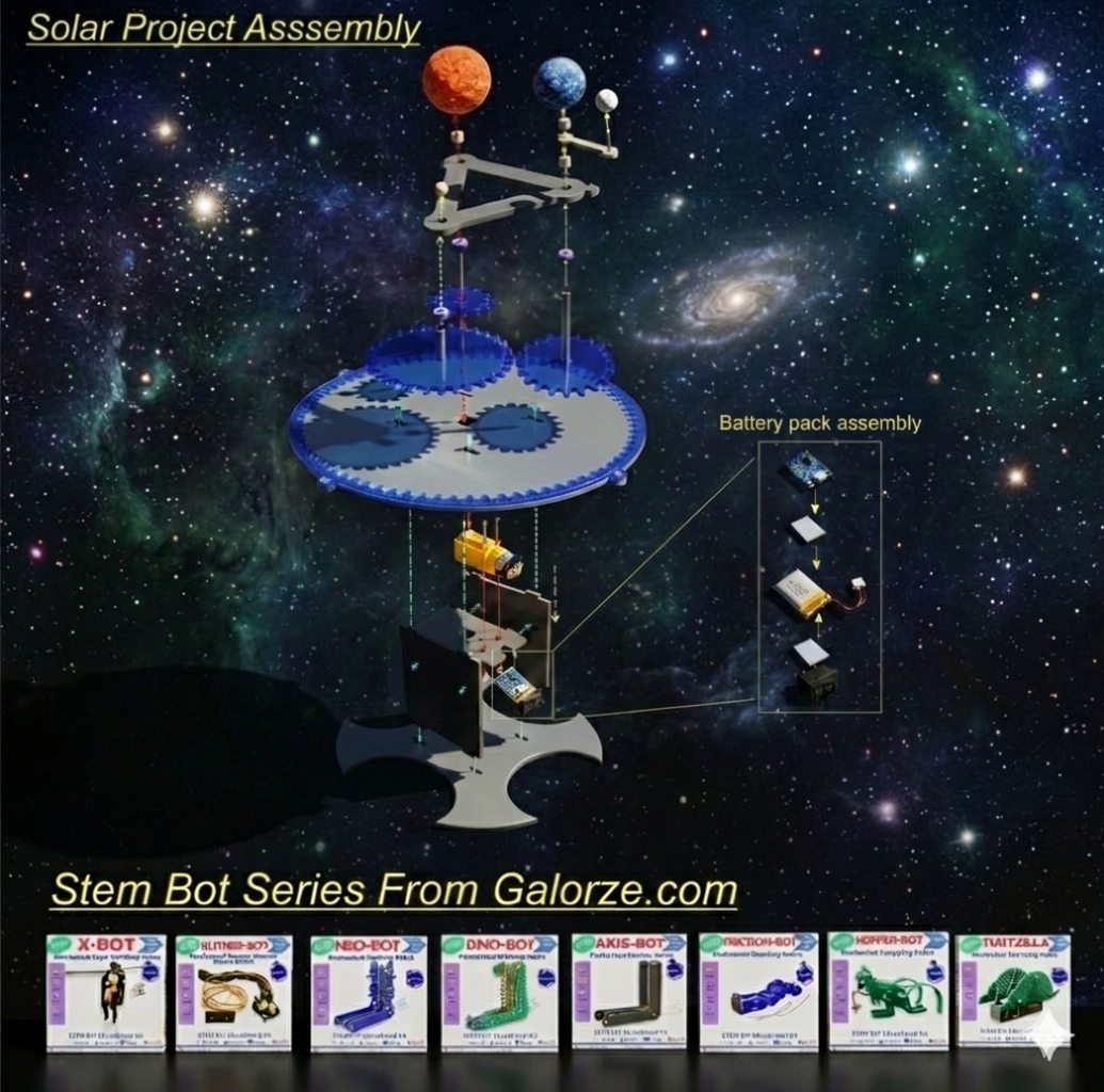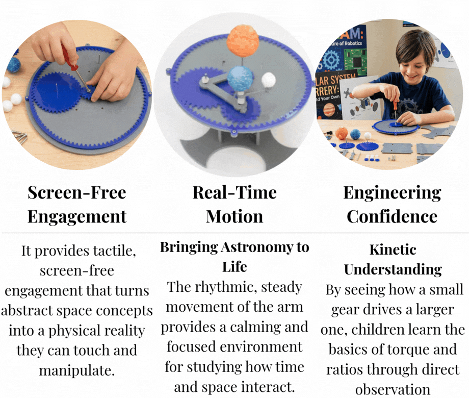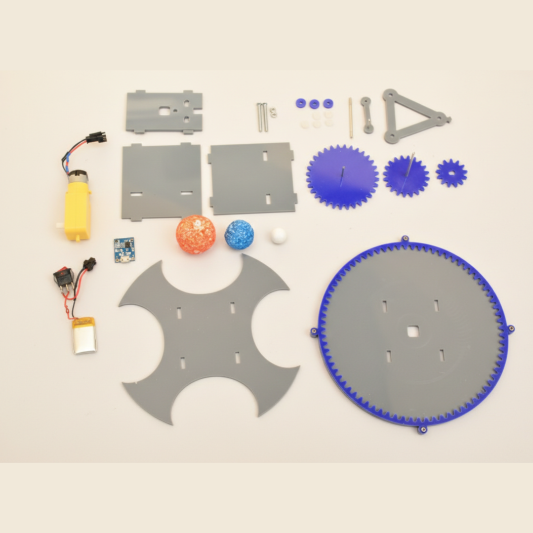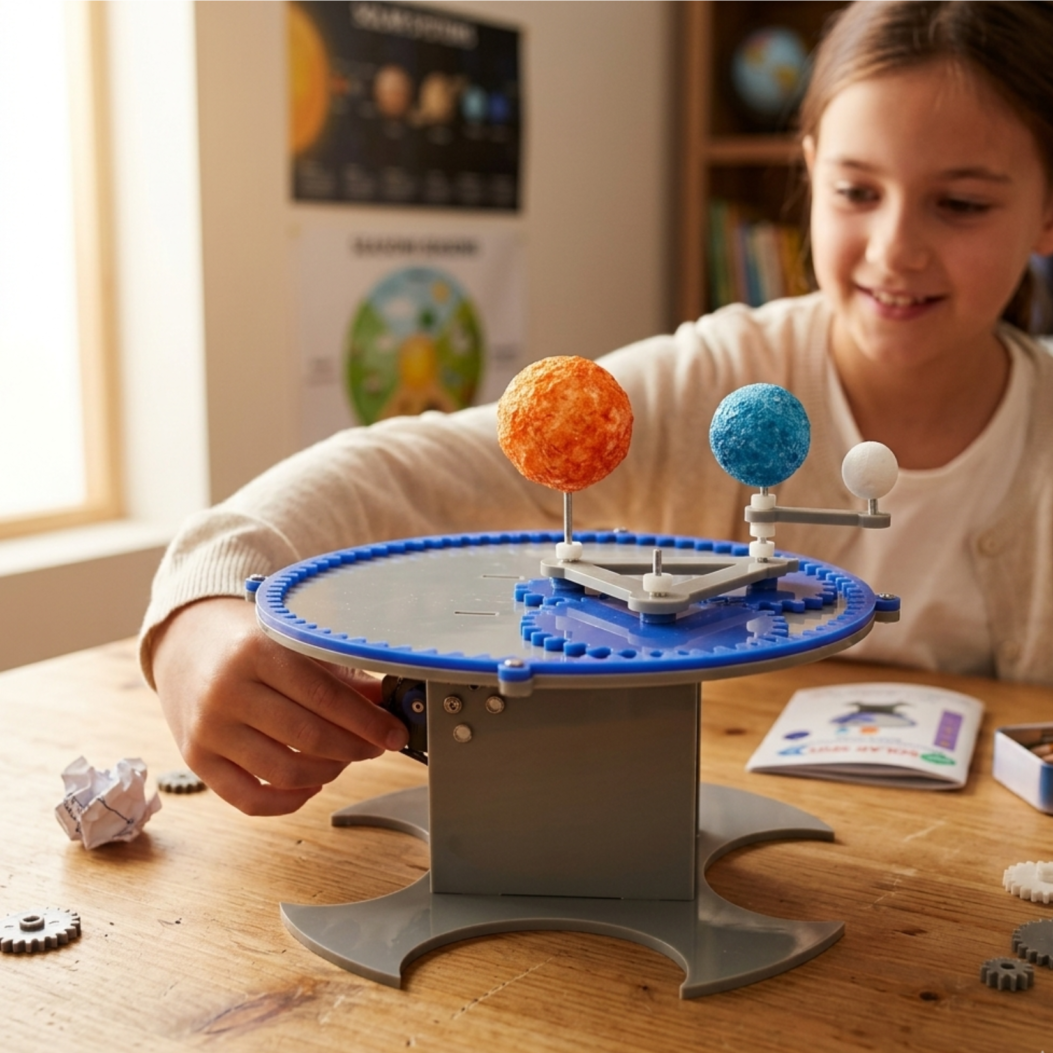 Solar- Spin. This Solar System Orbital Model (Orrery) is a hands-on STEM kit designed to bring astronomy to life. It features a motorized, gear-driven system that demonstrates the real-time movement of the Sun, Earth, and Moon.