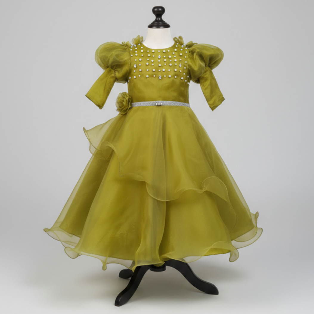 This stunning organza circular double layer girls frock features a unique design that will make your little one stand out at any event. The beautiful embellishments of pearls and stones add a touch of elegance, making it perfect for both casual and formal occasions.